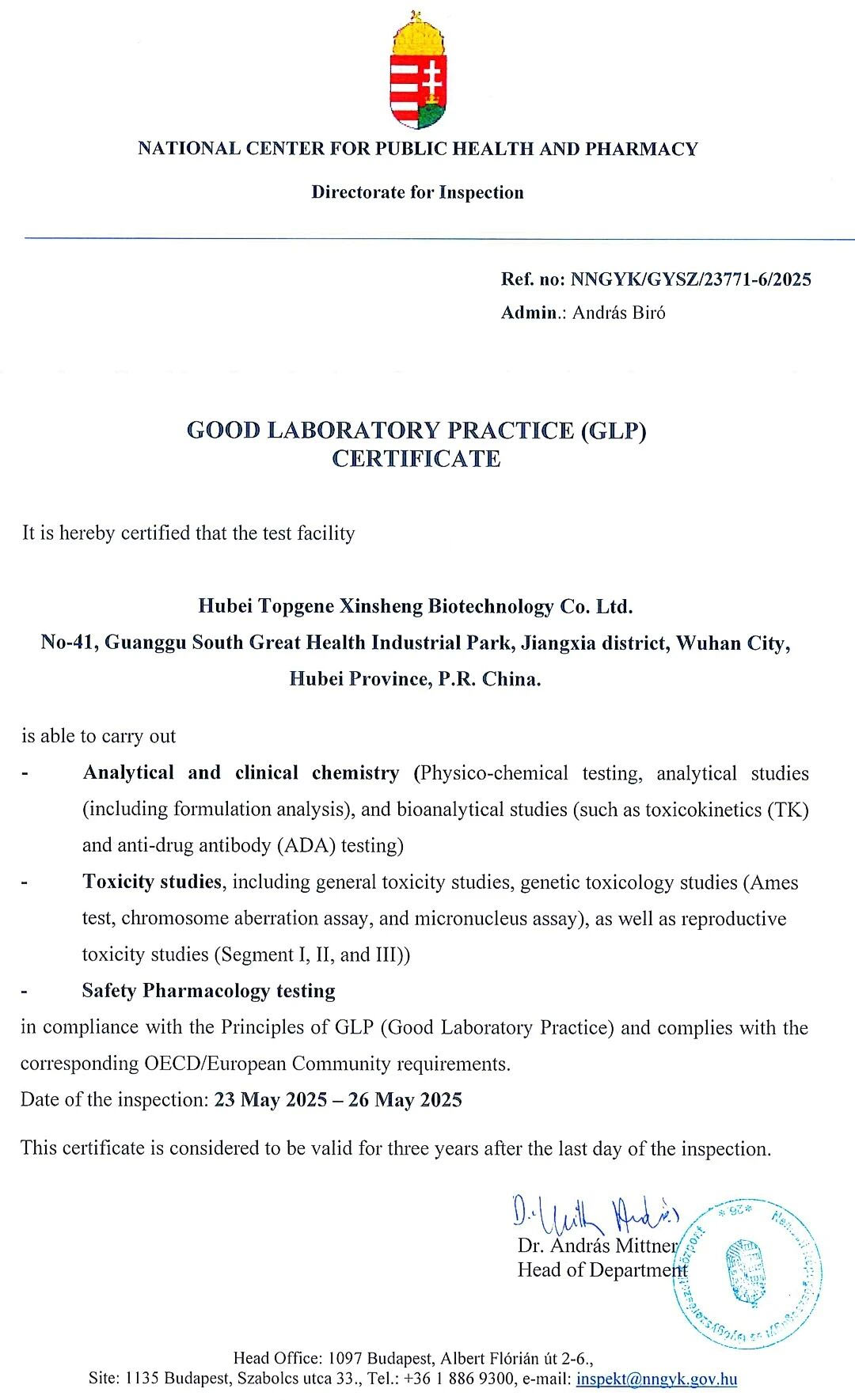 近日,湖北天勤鑫圣生物科技有限公司(以下簡(jiǎn)稱:“天勤鑫圣”)收到OECD成員國匈牙利國家公共衛(wèi)生和藥品中心(NNGYK)頒發(fā)的GLP證書,認(rèn)證內(nèi)容包括“分析和臨床化學(xué)(包括制劑分析、生物分析如TK,ADA等)”、“毒性試驗(yàn)(包括一般毒性、遺傳毒性和生殖毒性等)”和“安全藥理學(xué)試驗(yàn)”。