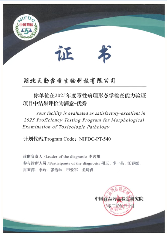 毒性病理形態(tài)學(xué)檢查是藥物臨床前毒理學(xué)評價的重要環(huán)節(jié)。為在毒性病理診斷領(lǐng)域持續(xù)保持高水平,天勤生物全資子公司湖北天勤鑫圣生物科技有限公司(以下稱“天勤鑫圣”)參加了由中國食品藥品檢定研究院組織的2025年度毒性病理形態(tài)學(xué)檢查能力驗證項目(NIFDC-PT-540),結(jié)果評價再次榮獲“優(yōu)秀”。